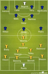 Chelsea (4-2-3-1): Begovic, Ivanovic, Terry, Cahill, Azpilicueta, Matic, Ramires, Pedro, Oscar, Willian, Costa.