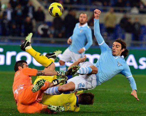 Lazio‘s defender Giuseppe Biava (R) fights for the ball with Chievo goalkeeper Christian Puggioni (L) and midfielder Bostjan Cesar during their Italian Serie A football match on January 26, 2013, at the Olympic stadium in Rome. Chievo won 1-0.