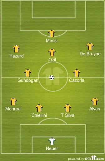 According to the report, if each position had a Ballon d’Or award, they would go to Thiago Silva (CB), Dani Alves (FB), Ilkay Gundogan (CDM), Santi Cazorla (CM), Mesut Ozil (CAM) and Lionel Messi (FW).