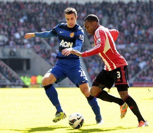 Sunderland’s English defender Danny Rose (R) vies with Manchester United‘s Dutch striker Robin van Persie (L) during the English Premier League football match at the Stadium of Light in Sunderland on March 30, 2013. Manchester United won the game 1-0.