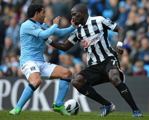 Manchester City’s Argentinian striker Carlos Tevez (L) vies with Newcastle United’s French midfielder Moussa Sissoko (R) during the English Premier League football match at the Etihad Stadium in Manchester on March 30, 2013. Manchester City won the game 4-0.