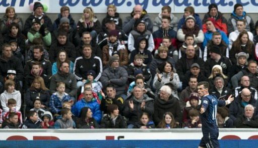 Tottenham Hotspur’s Welsh midfielder Gareth Bale (R) runs to celebrate in front of the home fans after scoring against Swansea City during the Premiership match at The Liberty Stadium in Swansea on March 30, 2013. Tottenham won the game 2-1.