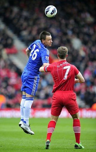 Chelsea’s English defender John Terry (L) vies with Southampton’s English striker Rickie Lambert (R) during the English Premier League football match at St. Mary’s Stadium in Southampton, England, on March 30, 2013. Southampton won the game 2-1.
