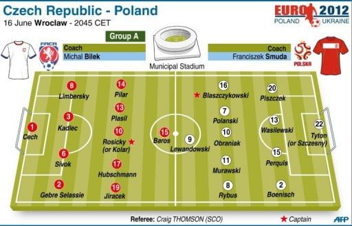 Teams for the Euro 2012 Group A match between the Czech Republic and Poland.