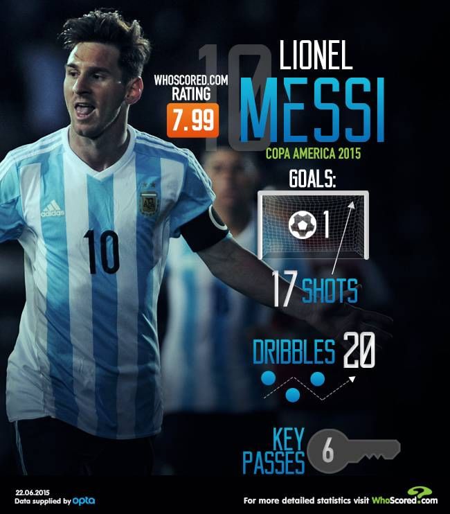 WhoScored’s best-rated player so far, however, is Argentina captain Lionel Messi, with a rating of 7.99. The Barcelona star has completed more successful dribbles (20), had more shots (17) and played more successful passes in the final third (89) than any other player. Tata’s side have struggled to impose themselves on Chile 2015 so far, netting just 4 goals - 1 of which was courtesy of Messi - but the 27-year-old is still performing to the standards expected of him, as one would imagine.