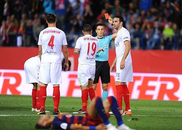 As the game looked destined to head towards extra-time, Sevilla midfielder Ever Banega was rightly given his marching orders, after he put in a horrible tackle to stop Neymar, who had latched on to a Messi through ball.