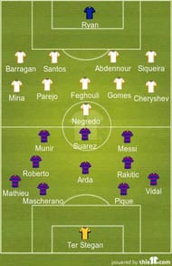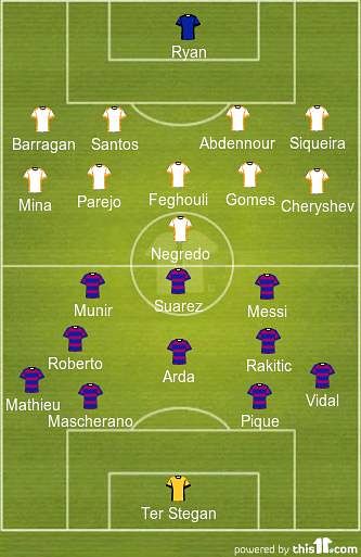 Barcelona (4-3-3): Ter Stegan; Vidal, Pique, Mascherano, Mathieu; Rakitic, Roberto, Arda; Messi, Suarez, Munir.