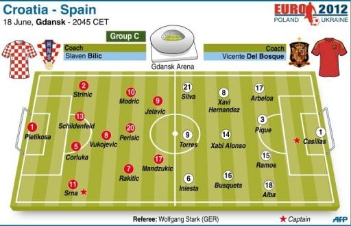 Teams for the Euro 2012 Group C match between Croatia and Spain.