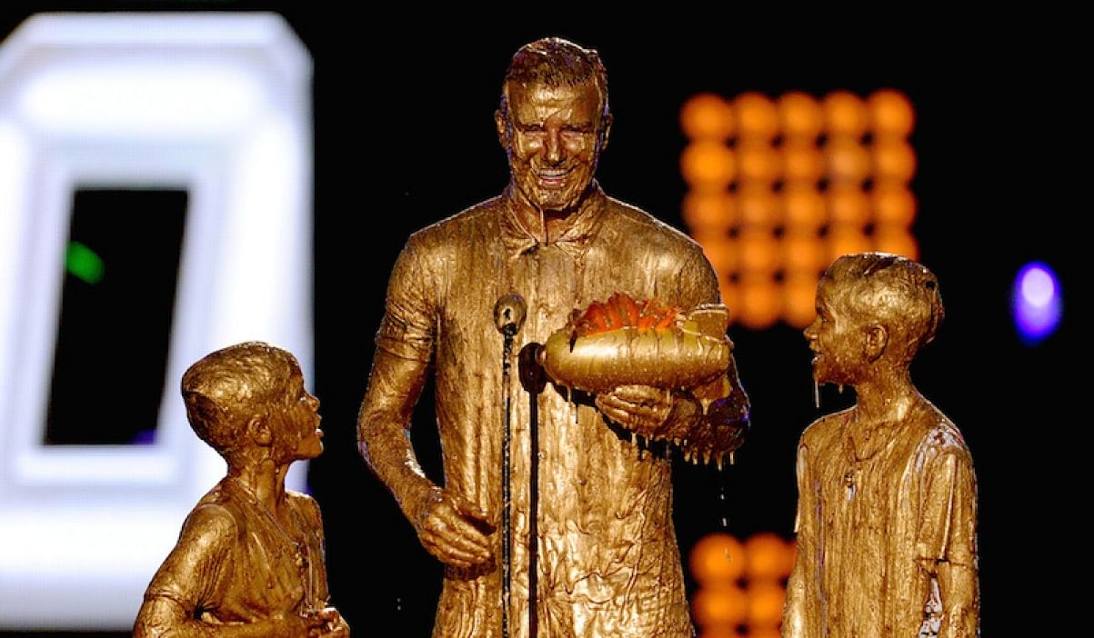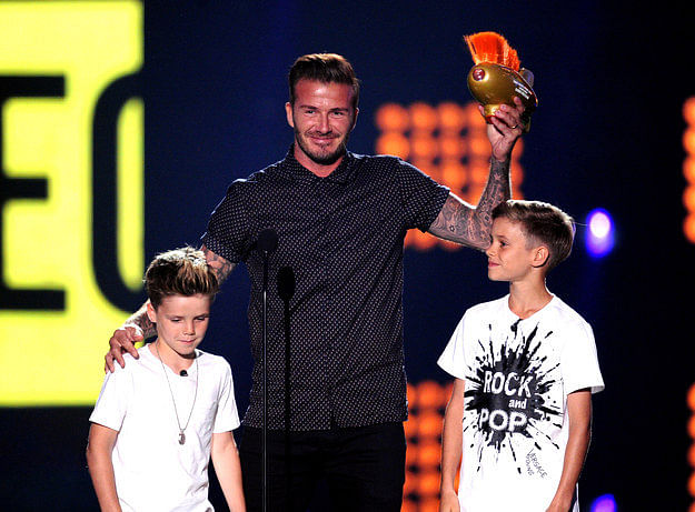 David Beckham and his sons Romeo and Cruz were in for a golden surprise as they were subject to a prank by Nickelodeon during an awards ceremony. The former Manchester United, Real Madrid and AC Milan star was due to receive the legend awards at Nickelodeon Kids' Choice Sports Awards at the Pauley Pavilion in Los Angeles, California. Just after receiving the award, the Beckhams were subjected to high pressure jet-streams of golden goo from both sides for about five seconds as the audience cheered on.