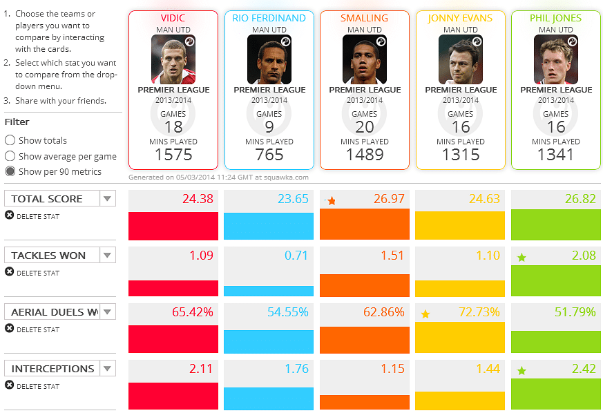 This includes England international Phil Jones who is currently injured. Jones has been played in a number of positions by Moyes and his predecessor Sir Alex Ferguson but clearly favours and is best in the heart of a defence. He has won 53% of the 58 tackles challenged for and 52% of the 56 headers while making over two interceptions per match. His pass completion is also excellent with 88% of passes completed, equal fourth best among the squad.