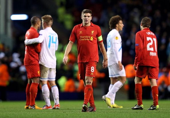 LIVERPOOL, ENGLAND – FEBRUARY 21: A dejected Steven Gerrard of Liverpool walks off the pitch following his team’s exit from the competition during the UEFA Europa League round of 32 second leg match between Liverpool FC and FC Zenit St Petersburg