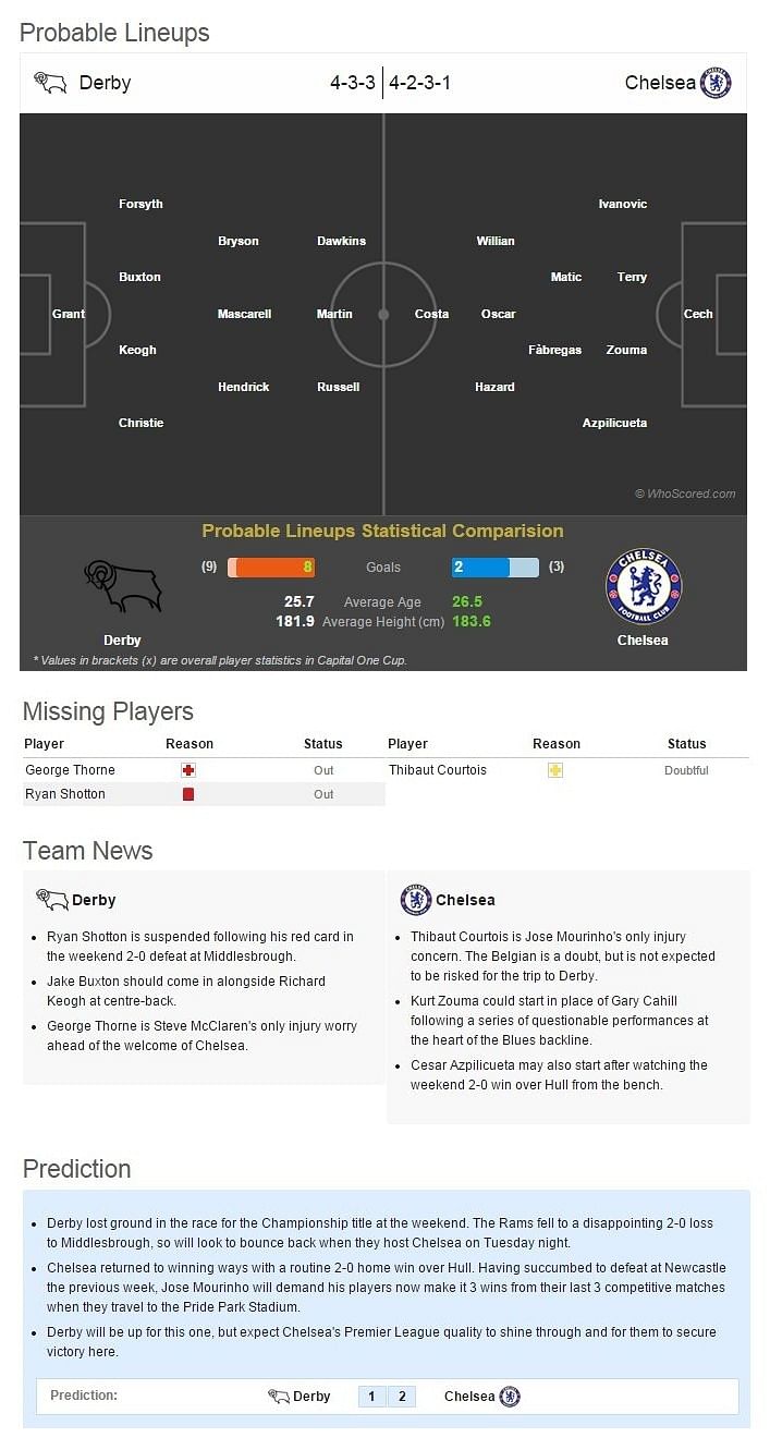 Capital One Cup Statistical preview: Championship side Derby host Premier League leaders Chelsea