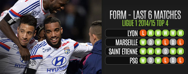 Their local rivals – and the last team to beat them – Saint Etienne can’t completely be ruled out, especially given that Renaud Cohade’s late (and anecdotal) own goal on Saturday was the first Stéphane Ruffier had conceded in 709 minutes. Yet their modest offensive power (24 goals, compared to Lyon’s 43 and Marseille’s 39) means they are long shots.