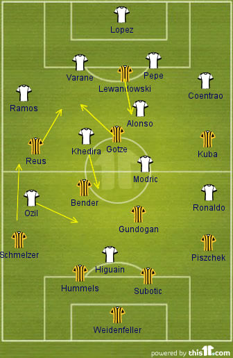 Mourinho left Angel Di Maria out from the team that he had announced earlier, and in came Luka Modric. So Mesut Ozil was shifted to the right with Modric coming in as the advanced midfielder in the 4-3-3. Jurgen Klopp made slight tweaks by playing Ilkay Gundogan over captain Sebastian Kehl, and further shifted Marco Reus to the left by starting with Jakub “Kuba” B?aszczykowski rather than Kevin Grosskreutz. On paper Dortmund looked a 4-2-3-1 with Mario Gotze in the hole.