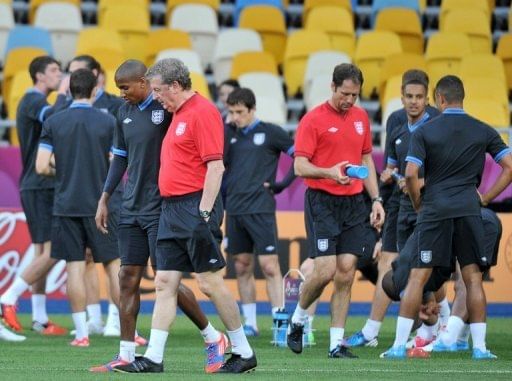 England coach Roy Hodgson talks to midfielder Ashley Young during a training session at the Olympic stadium in Kiev on June 14. England play their next Group D match against Sweden on June 15, kick-off 1845 GMT.