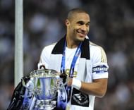 Swansea City’s English-born Welsh defender Ashley Williams celebrates with the trophy after the League Cup final football match between Bradford City and Swansea City at Wembley Stadium in London, England on February 24, 2013. (GLYN KIRK,GLYN KIRK/AFP/Getty Images)