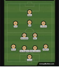 Tottenham Hotspur (4-2-3-1): Lloris; Walker, Alderweireld, Vertonghen, Rose; Dembele, Dier; Eriksen, Alli, Son; Kane
