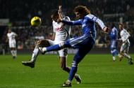 SWANSEA, WALES – JANUARY 31: David Luiz of Chelsea clears the ball as Steven Caulker of Swansea closes in during the Barclays Premier League match between Swansea City and Chelsea at Liberty Stadium on January 31, 2012 in Swansea, Wales.
