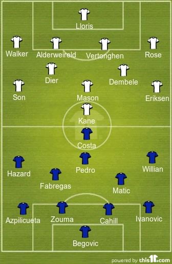 Chelsea (4-2-3-1): Begovic, Ivanovic, Cahill, Terry, Azpilicueta, Matic, Fabregas; Willian, Pedro, Hazard, Costa