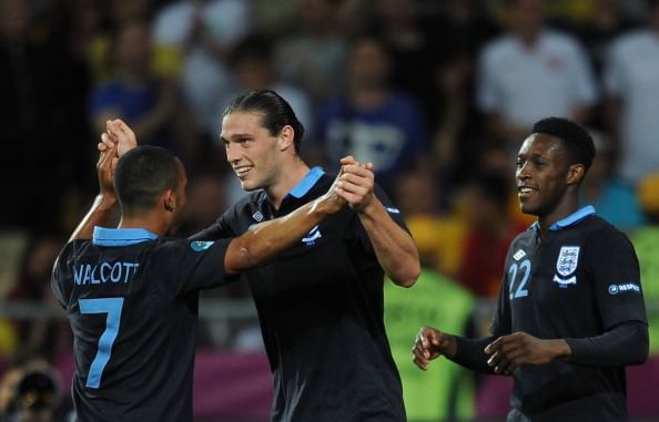 KIEV, UKRAINE – JUNE 15: Danny Welbeck of England celebrates scoring their third goal Theo Walcott and Andy Carroll of England during the UEFA EURO 2012 group D match between Sweden and England at The Olympic Stadium on June 15, 2012 in Kiev, Ukraine. (Photo by Christopher Lee/Getty Images)