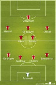 Spain’s midfield maestro had a very bitter end to his tournament as the reigning champions were knocked out of the tournament in the round of 16 after a 2-0 loss to Italy. The 2012 Player of the Tournament had a pretty decent tournament overall as he assisted Spain’s winner in Spain’s tournament opener against the Czech Republic and was subsequently awarded the Man of the Match.He produced another Man of the Match performance against Turkey as he set up Spain’s third goal of the match. In Spain’s last 16 clash against Italy, Iniesta was brilliant in the middle of the park but did not receive adequate assistance from his teammates. He created numerous scoring opportunities for his teammates and gave the Italians a tough time through his skillful play. Spain might have had a disappointing tournament but Iniesta’s performance was commendable throughout the tournament.Left Winger- Eden Hazard