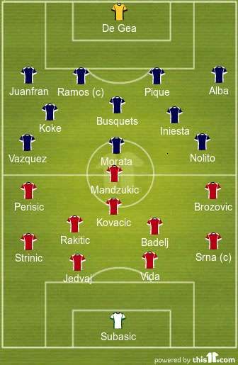 Luka Modric left the field against the Czech Republic, in visible discomfort. The Croatian playmaker appears to have suffered a groin injury and is unlikely to be fit enough to square off against his La Liga compatriots. Modric will probably be replaced by Kovacic in the line-up. Vedran Corluka needed stitches after a clash of heads in the match against the Czech Republic and he too is a doubt for this fixture. Spain do not have any injuries to report and Vicente Del Bosque will have all 23 players available for selection.