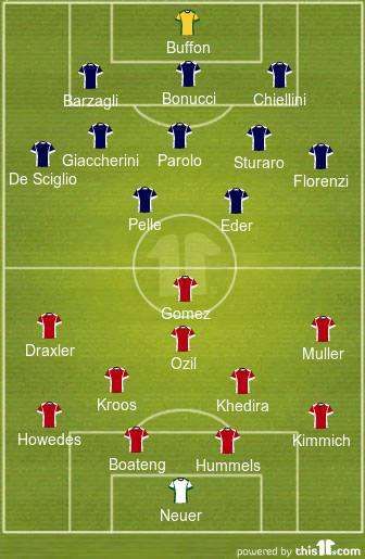 Italy: Buffon; Barzagli, Bonucci, Chiellini; Florenzi, Sturaro, Parolo, Giaccherini, De Sciglio; Pellè, Éder