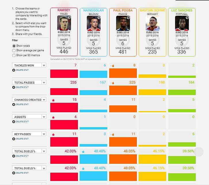 Here is a comparison of Euro 2016’s top 5 midfielders, do note that I have picked only midfielders who scored and also since the Italian midfield was rotated a lot it was difficult to identify a single player.