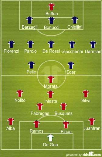 Spain: De Gea; Juanfran, Piqué, Ramos, Alba; Busquets, Fàbregas; Silva, Iniesta, Nolito; Morata
