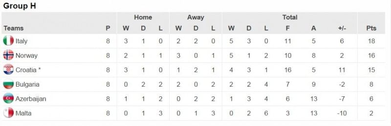 Italy stole a 1-0 win against Bulgaria to propel themselves to the top of Group H. Things however remain tight on top of Group H as they are closely followed by Norway, who beat Croatia 2-0 on the night and jump over them in the group table. The two sides at the foot of the table Azerbaijan and Malta played out a 2-2 draw that helped neither side with on 2 qualifiers left for each team to play