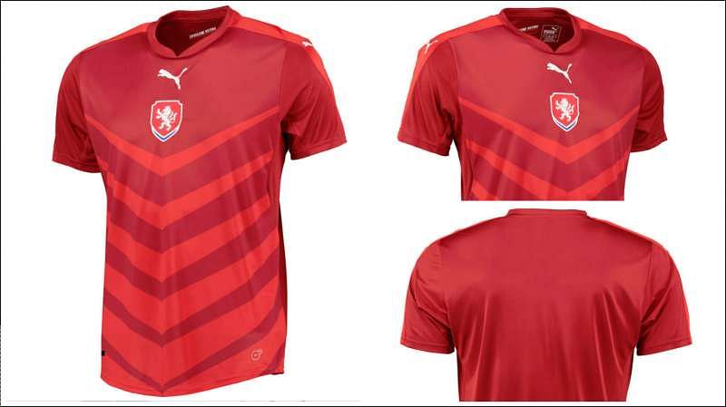 The Czechs will flaunt a red coloured home jersey in France, later this month. The Czech Republic home kit features red as its primary colour with a number of orange arrow-shaped stripes in descending order of their width.