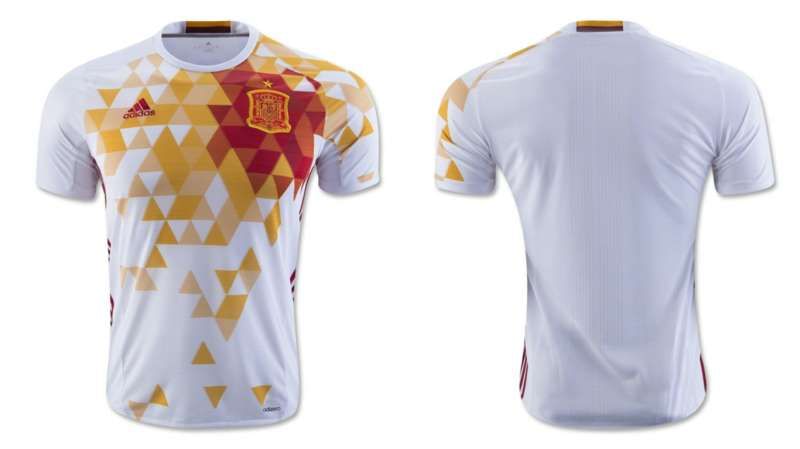 The defending champions, Spain will sport a traditional white away jersey in the upcoming edition of the Euros. Although white in colour, the Spanish away jersey showcases a number of triangles in yellow and red- both separate as well as clubbed together.