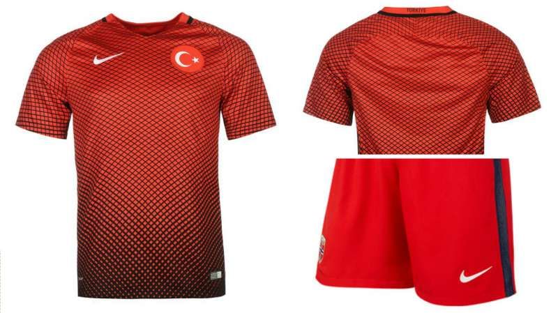 The Turkish home kit is a treat to watch since it gradually gains a darker shade when viewed from top to bottom. The logo of its manufacturer, Nike and that of the famous Turkish crescent are present at the front of their home kit.
