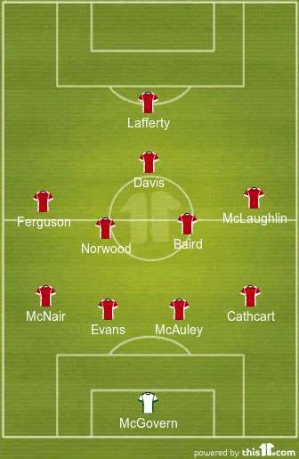 Northern Ireland (4-4-1-1): McGovern, Cathcart, McAuley, Evans, McLaughlin, McNair, Baird, Norwood, Ferguson, Davis, Lafferty.