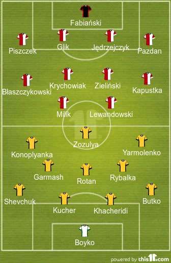 Ukraine (4-3-2-1): Boyko; Butko, Khacheridi, Kucher, Shevchuk; Rybalka, Rotan, Garmash; Yarmolenko, Konoplyanka; Zozulya.