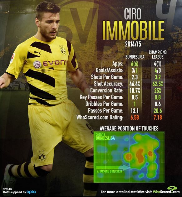 Until Bayern bought Mehdi Benatia from Roma for €28m at the end of the transfer window, Immobile was the most expensive new signing in the Bundesliga. He is also the third biggest in Dortmund history. Much was expected although few considered Immobile capable of replacing the Bayern-bound Robert Lewandowski on his own.