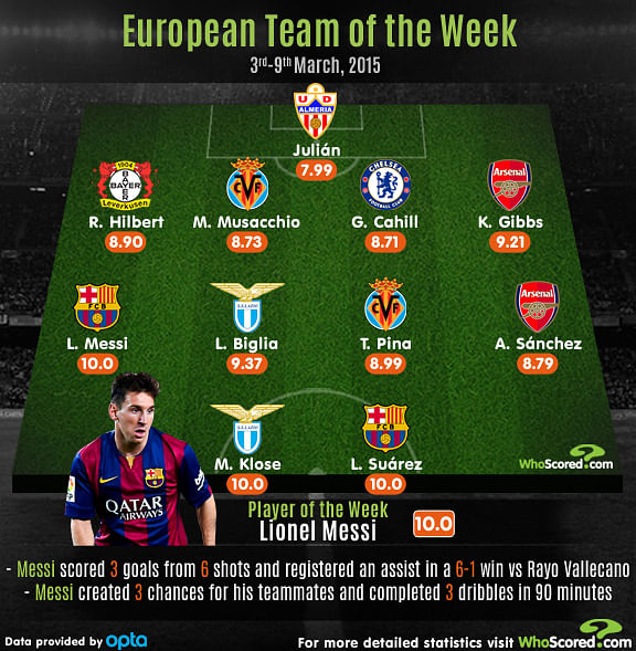 Using out unique rating system, we formulate a highest rated team of the week from Europe's top 5 leagues, including Arsenal duo Kieran Gibbs and Alexis Sanchez, Barcelona duo Lionel Messi and Luis Suarez and Chelsea's Gary Cahill.