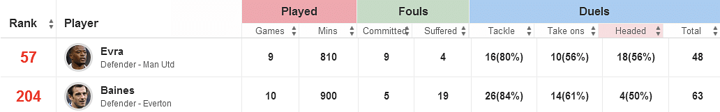 Baines’ brace of free kicks against West Ham prove he is a threat at set pieces, while as a life long Red I cannot recall a single time Evra has even stood menacingly near a dead ball, let alone taken one. Baines also has the edge in duels won, winning more of his tackles and taking on more players than Evra, although the United man is slightly more effective in the air.