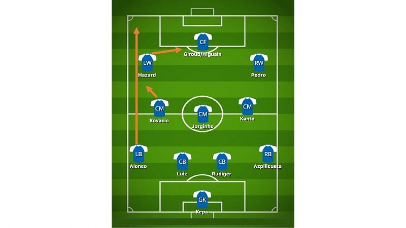Under Conte and Sarri, Marcos Alonso pushed deep into opposition half regularly which created a conundrum for the opposition defenders. Either they could mark Alonso and stop him from delivering his crosses or they could stick to Hazard and let Alonso move further up the pitch. Whenever the opposition chose to stick to Hazard, Alonso had space and time to attack. Alternatively, in case of not being marked by the defenders, Hazards cut inside the left channel quickly and effortlessly dribble his way through a host of defenders to either produce a key pass or take a shot. Whenever there was no room to maneuver the ball, Hazard always had the option of passing to left central midfielder.