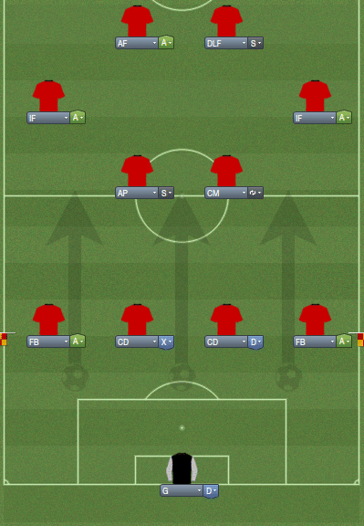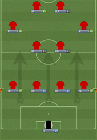 Being an extremely unconventional formation, it can be employed where a person has three technically proficient and pacey centre-backs who can cover the defensive phase, whether it may be in the middle or on the flanks. They will get support from the wide midfielders who will mainly look to stick to their position and play in a transitional way along the two halves of the field. A midfielder with decent defensive attributes and good passing is a perfect choice. The central part of the midfield will be manned by one attacking midfielder who will mainly receive the ball from the wide positions or from the anchor man in the midfield, who will be the first obstacle for any counter-attack in the midfield. Another midfielder will be in the defensive midfiled position but would like to orchestrate play from there with his vision and creativity, rather than lunging into tackles (eg. Pirlo). The attacking midfielders will act as a support for the two centre-forwards who will run into channels to look for any passes. Basically, this formation involves a narrow style of play but is extremely lethal in the game, especially with reputed teams.
