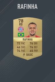 The Brazilian Right-back has a lot of potential in him and receives a rating of 78 in FIFA 17 (Same as in FIFA 16). Rafinha has been rated 76 for dribbling, 76 for defending, 74 for passing, 72 for pace, and 65 for physicality.