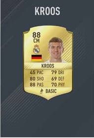 The German midfielder is a fantastic passer and a crucial member in the central midfield for the Los Blancos. Kroos has been rated 88 for his passing and looks to have reached his full potential (rated 86 in FIFA 16). The 26-year-old has the ability to shoot with power and has been rated 80 for shooting.
