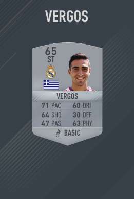 Vergos is on loan from Superleague Greece club, Olympiacos, and currently, plays for the reserve team for Real Madrid. The Greek striker has been rated an overall of 65 and receives 64 for shooting, 63 for physicality, and 60 for dribbling.