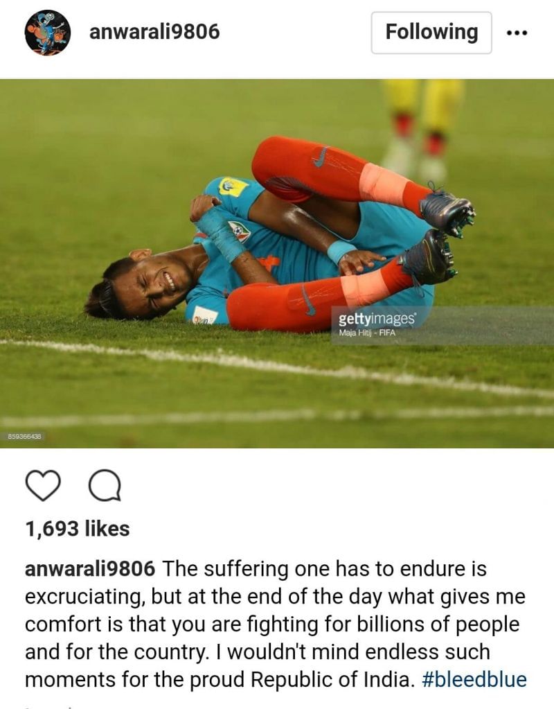 India U17 midfielder Nongdamba Naorem trolled his teammate Anwar Ali on his Instagram post regarding the foot injuries he sustained during India’s second group game against Colombia. Ali’s post had the caption: “The suffering one has to endure is excruciating, but at the end of the day what gives me comfort is that you are fighting for billions of people and for the country. I wouldn't mind endless such moments for the proud Republic of India. #bleedblue”
