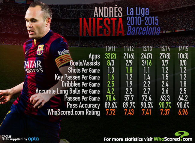 It seems almost heresy to say it, but should Andrés Iniesta really still be an automatic starter for club and country? The statistics suggest that so far this season the World Cup, double European Championship, three-time Champions League and six-time La Liga winner has fallen some distance from his best.
