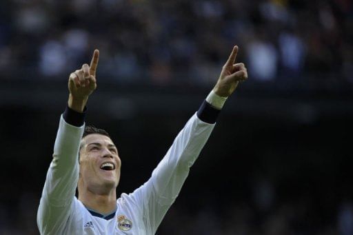 Real Madrid’s forward Cristiano Ronaldo celebrates after scoring during their Spanish league football match against Levante at the Santiago Bernabeu stadium in Madrid on April 6, 2013. Barcelona won 5-1.