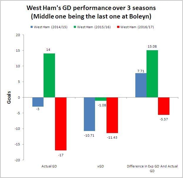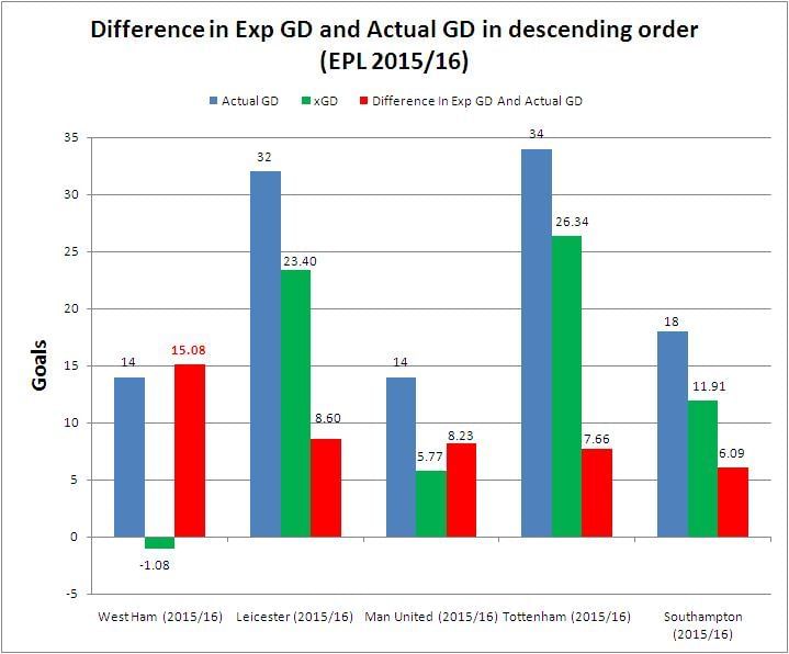 In the 2015/16 season, West Ham finished with an Actual Goal Difference (AGD) of 14 but the xGD metric put them on a goal difference of -1.08. The net difference between their Actual Goal Difference (AGD) and their Expected Goal Difference (xGD) was a staggering 15.08 (this number is of prime importance here, calculated like this: AGD-xGD or 14 - (-1.08) = 15.08).