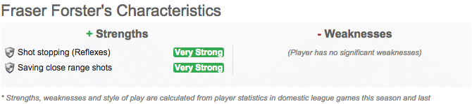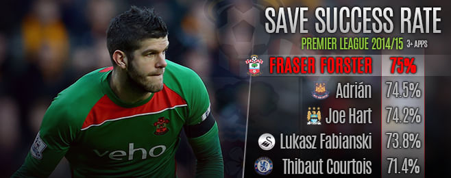 In the past 3 seasons, Joe Hart has made 10 errors that have led directly to a goal in the Premier League - at least 2 more than any other player. Questions about Hart's consistency have beleaguered him in recent seasons and he was even given a timeout by City boss Manuel Pellegrini last season as Costel Pantilimon was given a run of matches. Considered indispensable by Lennon, Forster made just a single error in his 14 Champions League appearances for Celtic and is yet to make one in the Premier League this season. Forster also currently boasts the best save success rate in the league at 75% - just edging Joe Hart at 74.2%.