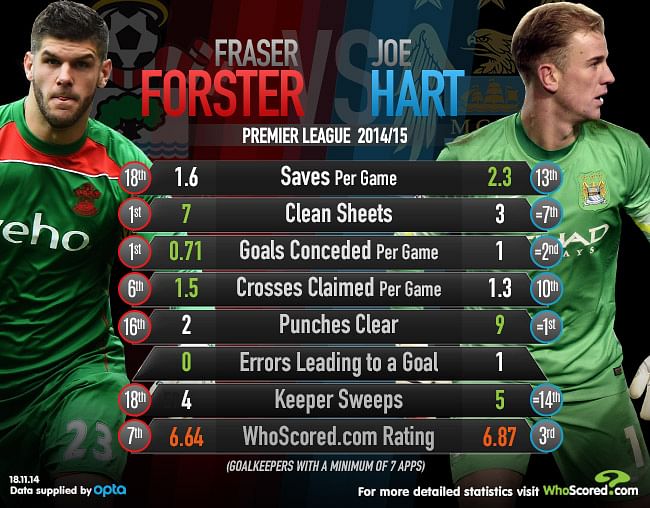 As Lennon had anticipated it would be "impossible to keep [him]" with the way he was playing, Forster made the move to Southampton this summer, adapting seamlessly to the Premier League. Saints currently have the best defense in the Premier League, conceding just 5 goals in their opening 11 fixtures. While Forster has kept a clean sheet in 7 of those games at a so-called 'lesser' club, Hart has managed to keep just 3 Premier League clean sheets this season. Playing for the current champions will always make Hart the easier choice, but as it stands Forster's Southampton sit second in the league just behind Chelsea having conceded 7 fewer goals than Hart's Manchester City.