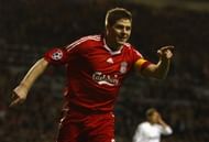 Steven Gerrard of Liverpool celebrates scoring his team’s third goal during the UEFA Champions League Round of Sixteen, Second Leg match between Liverpool and Real Madrid at Anfield on March 10, 2009 in Liverpool, England. (Photo by Clive Mason/Getty Images)